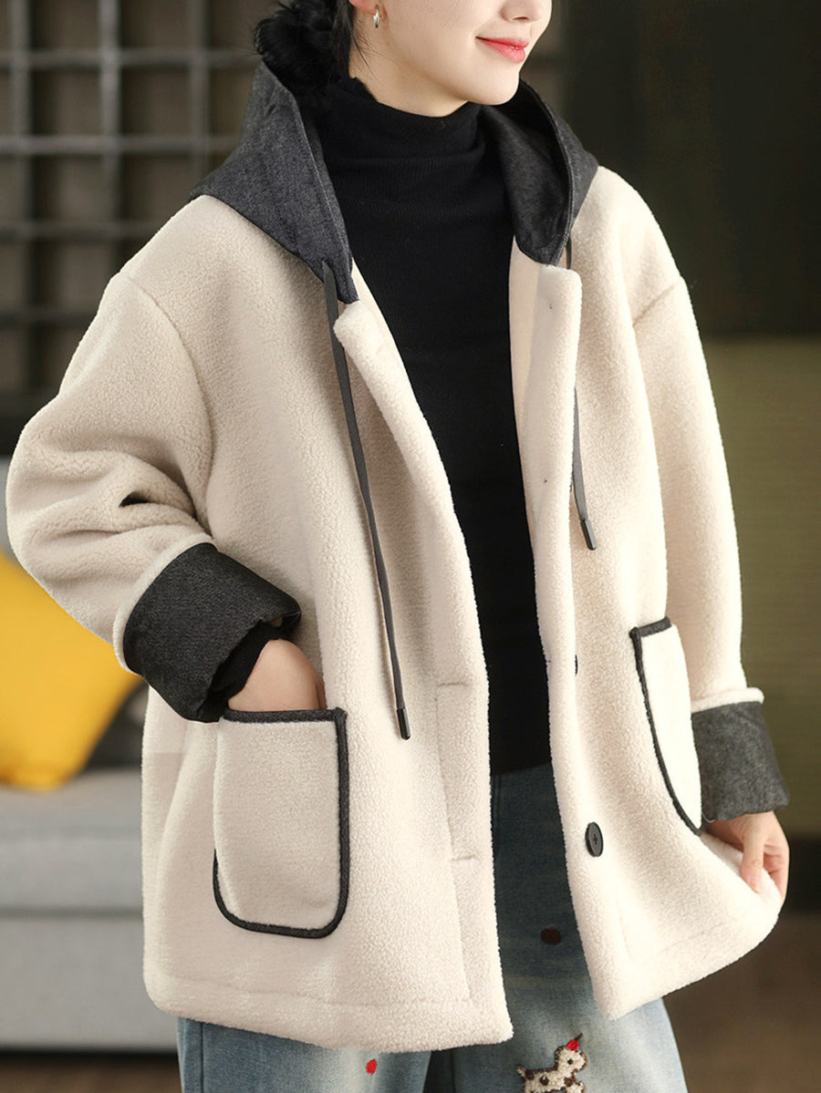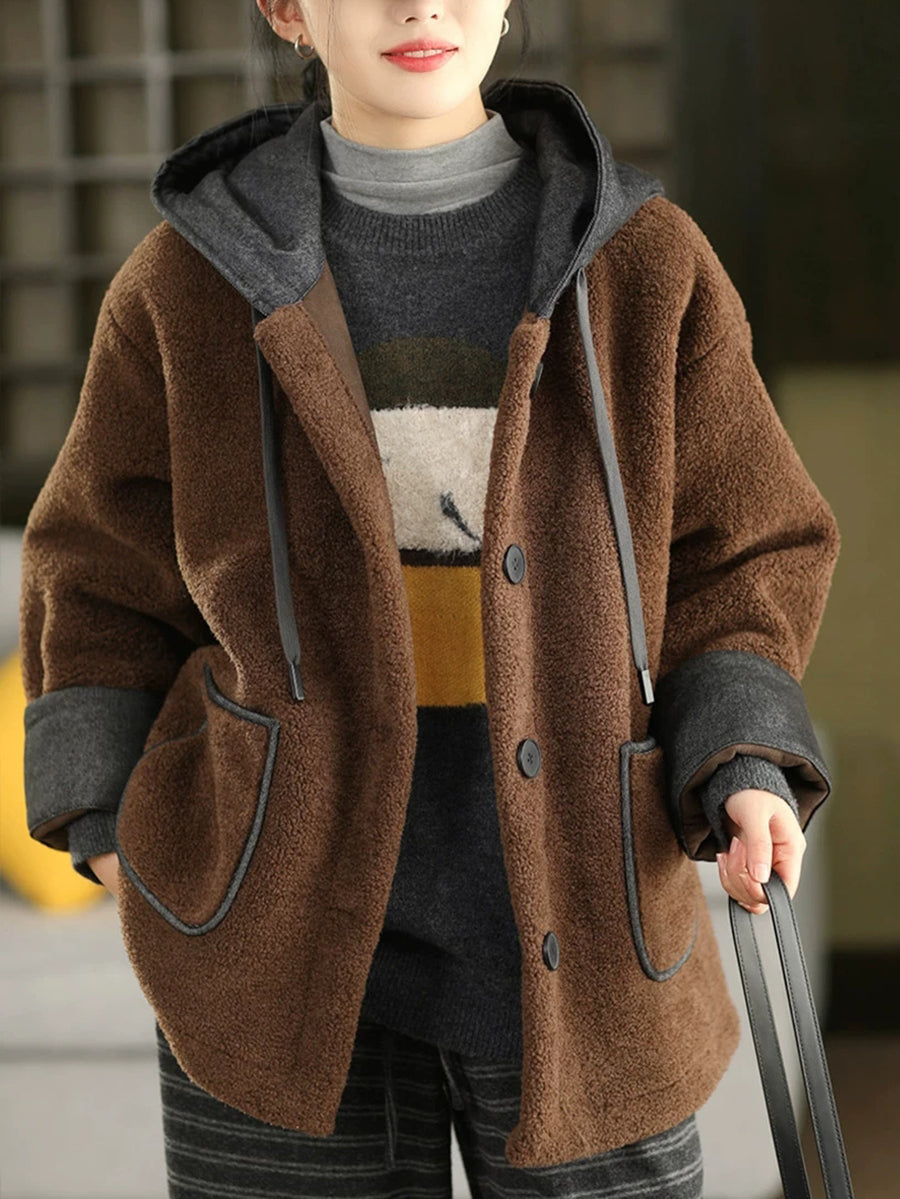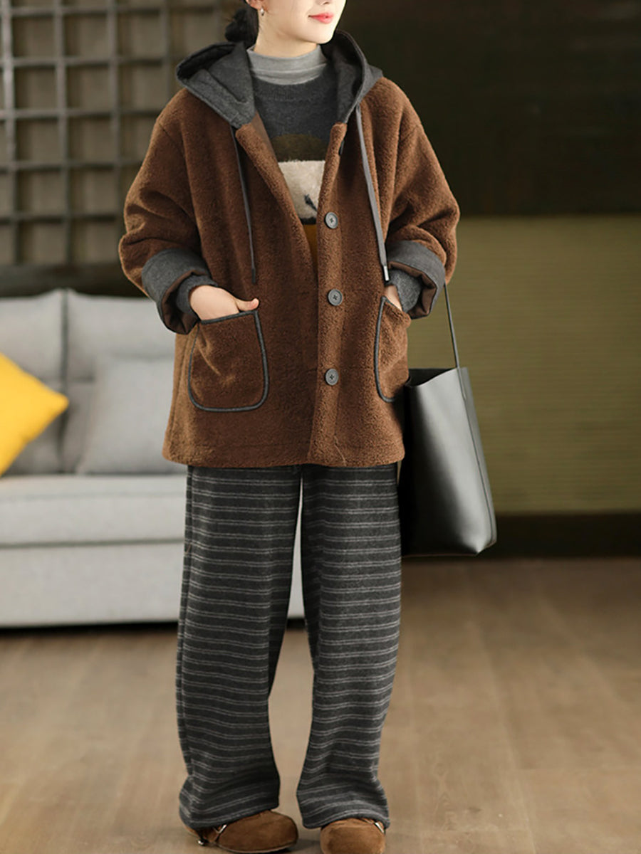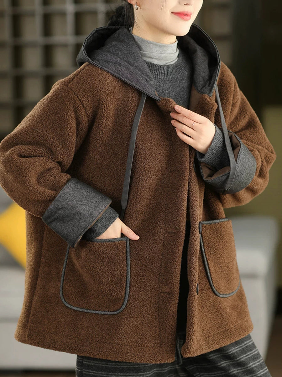 Women Winter Retro Colorblock Hooded Fleece Coat