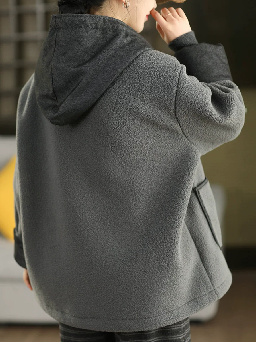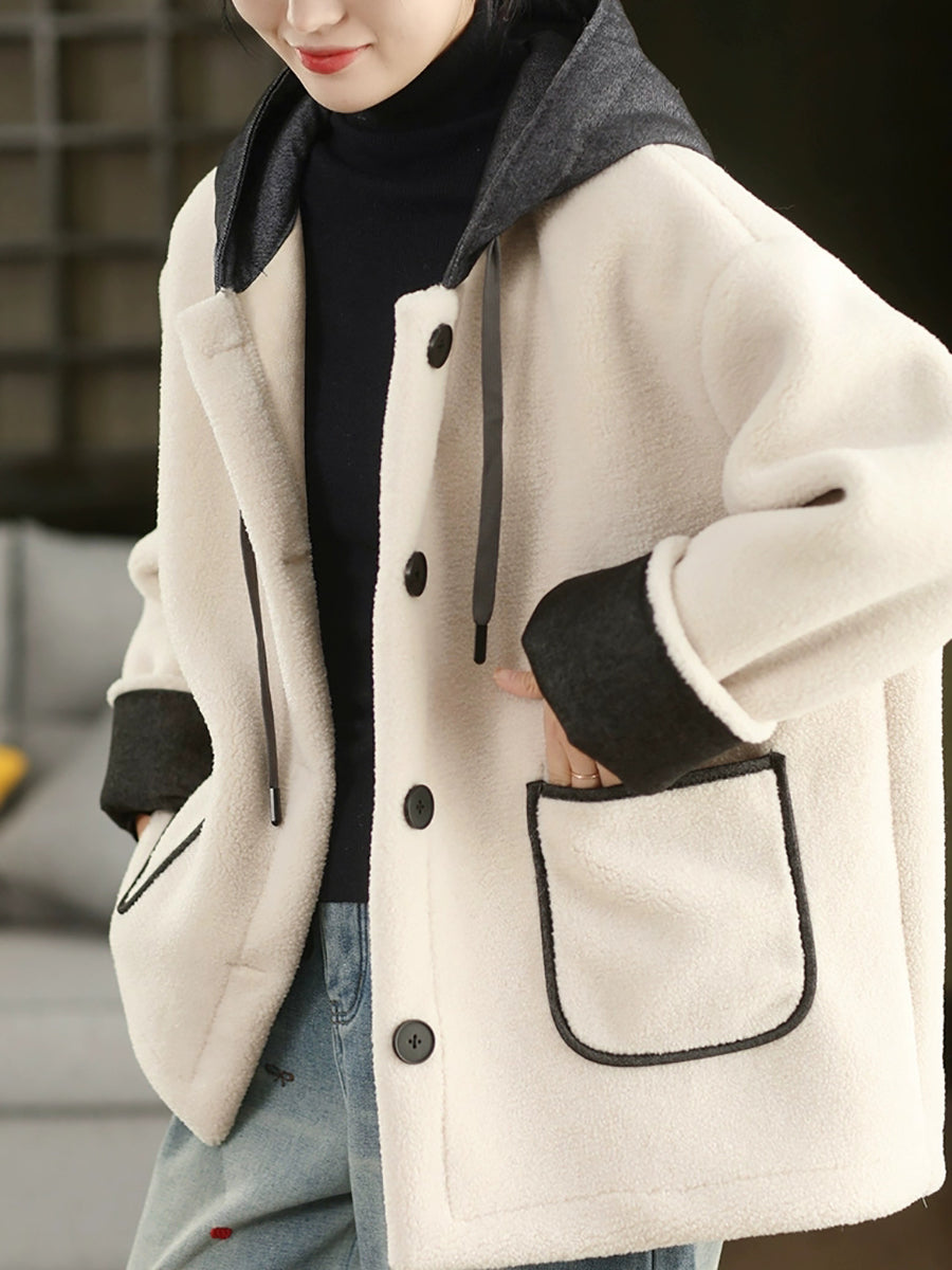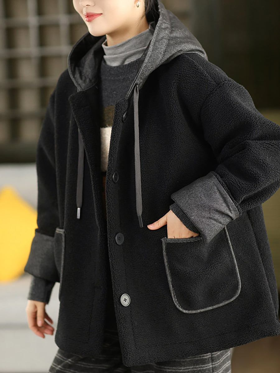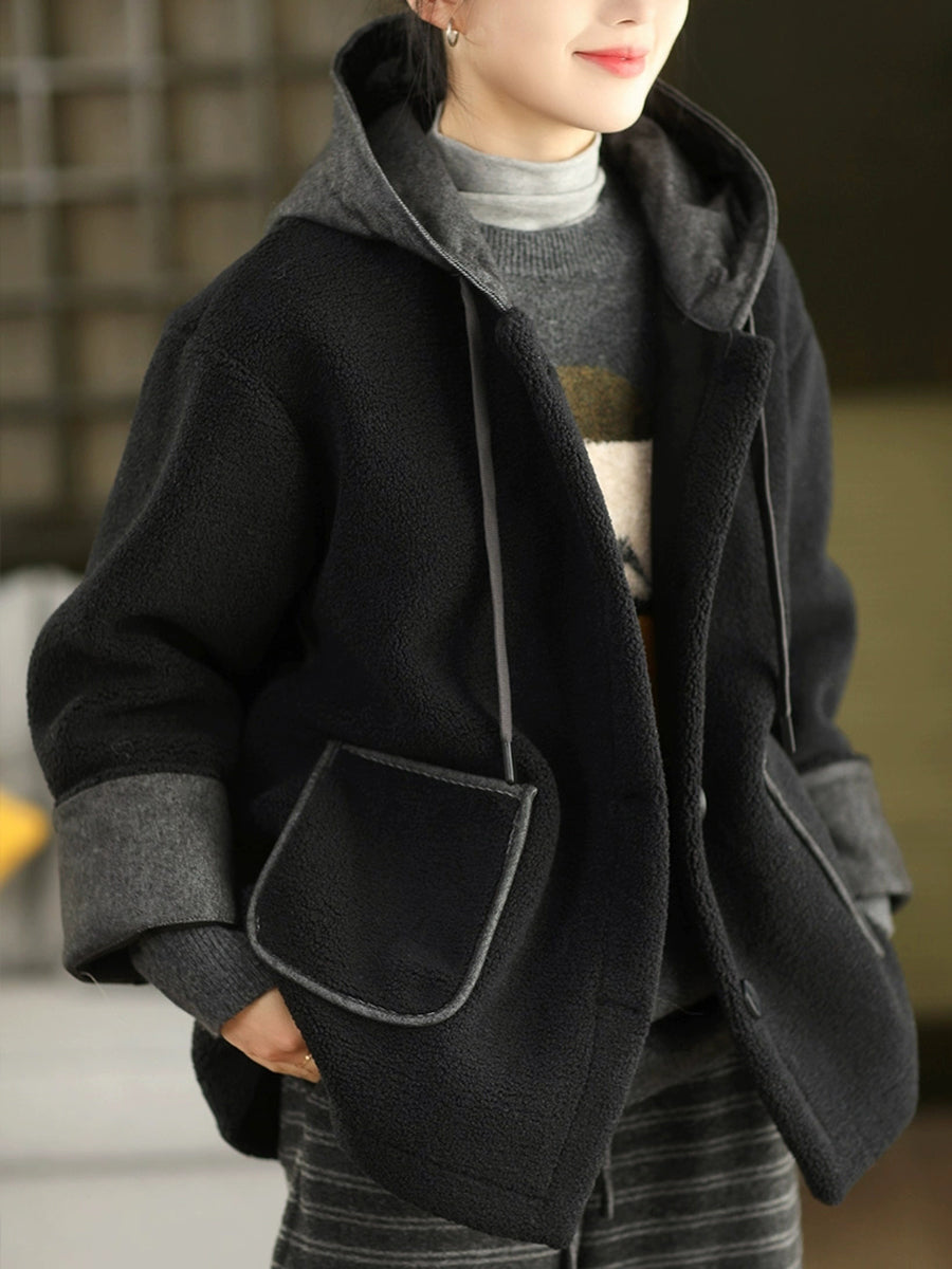 Women Winter Retro Colorblock Hooded Fleece Coat