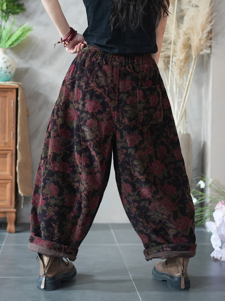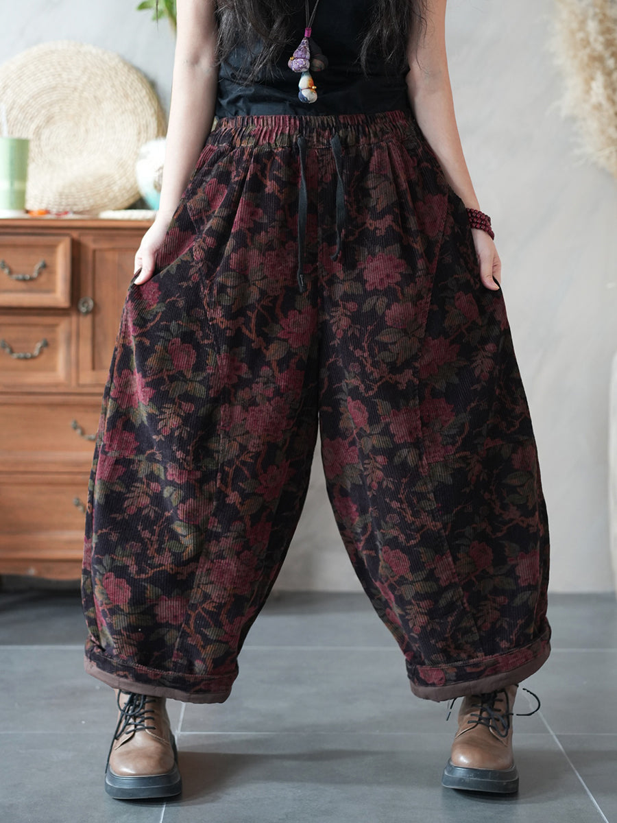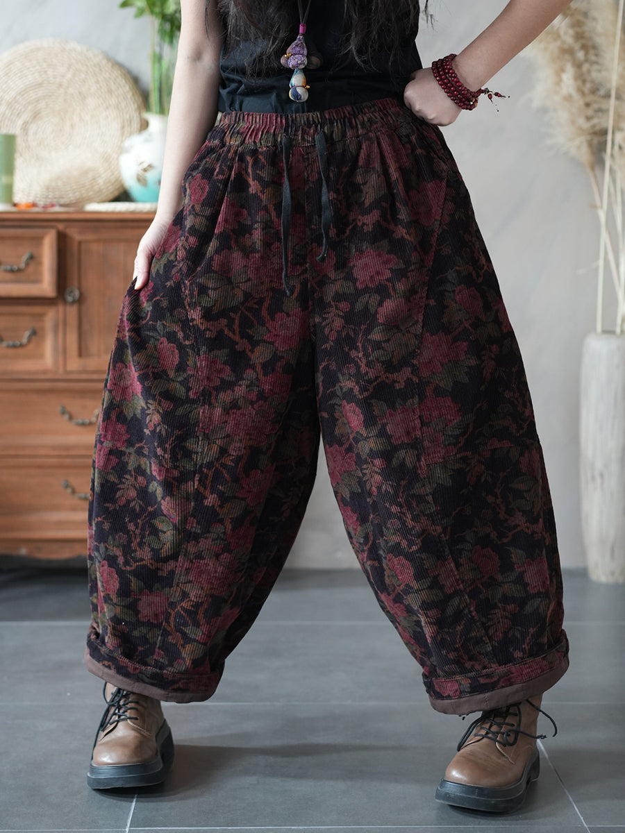 Women Winter Retro Flower Corduroy Padded Harem Pants