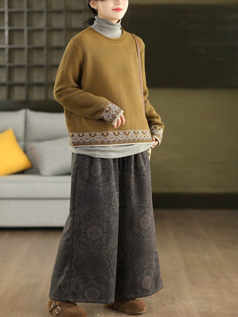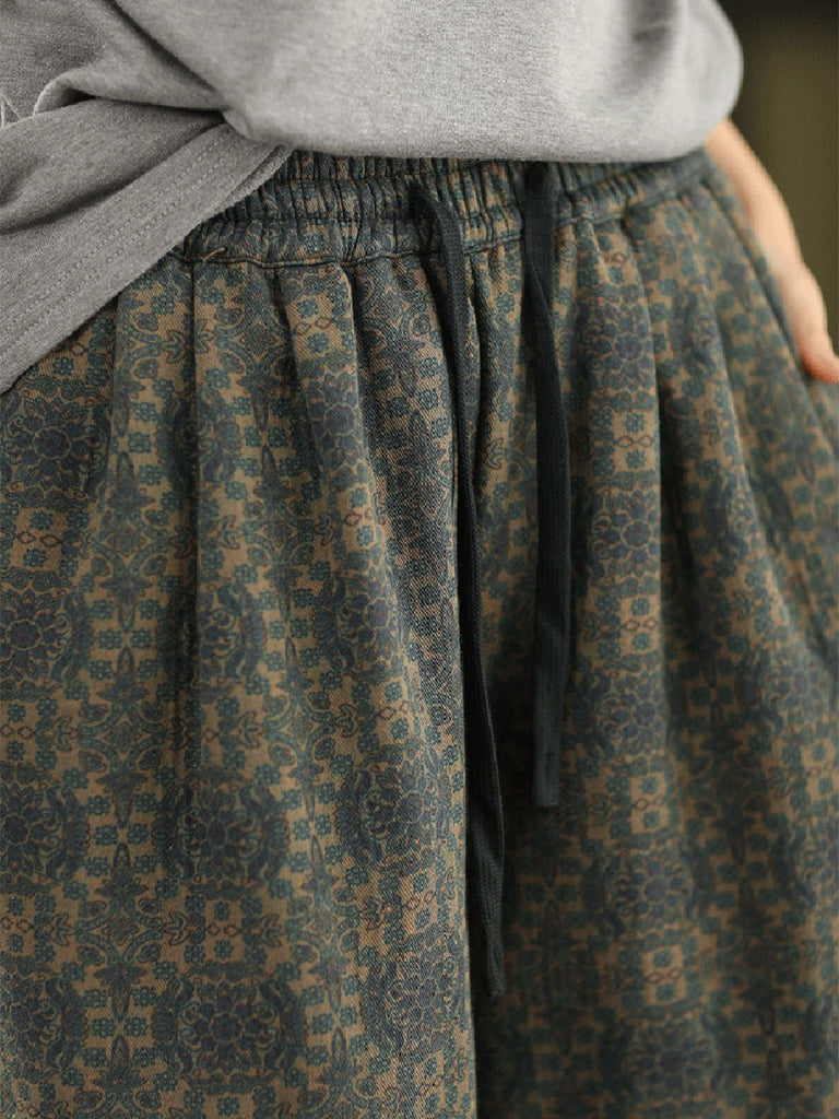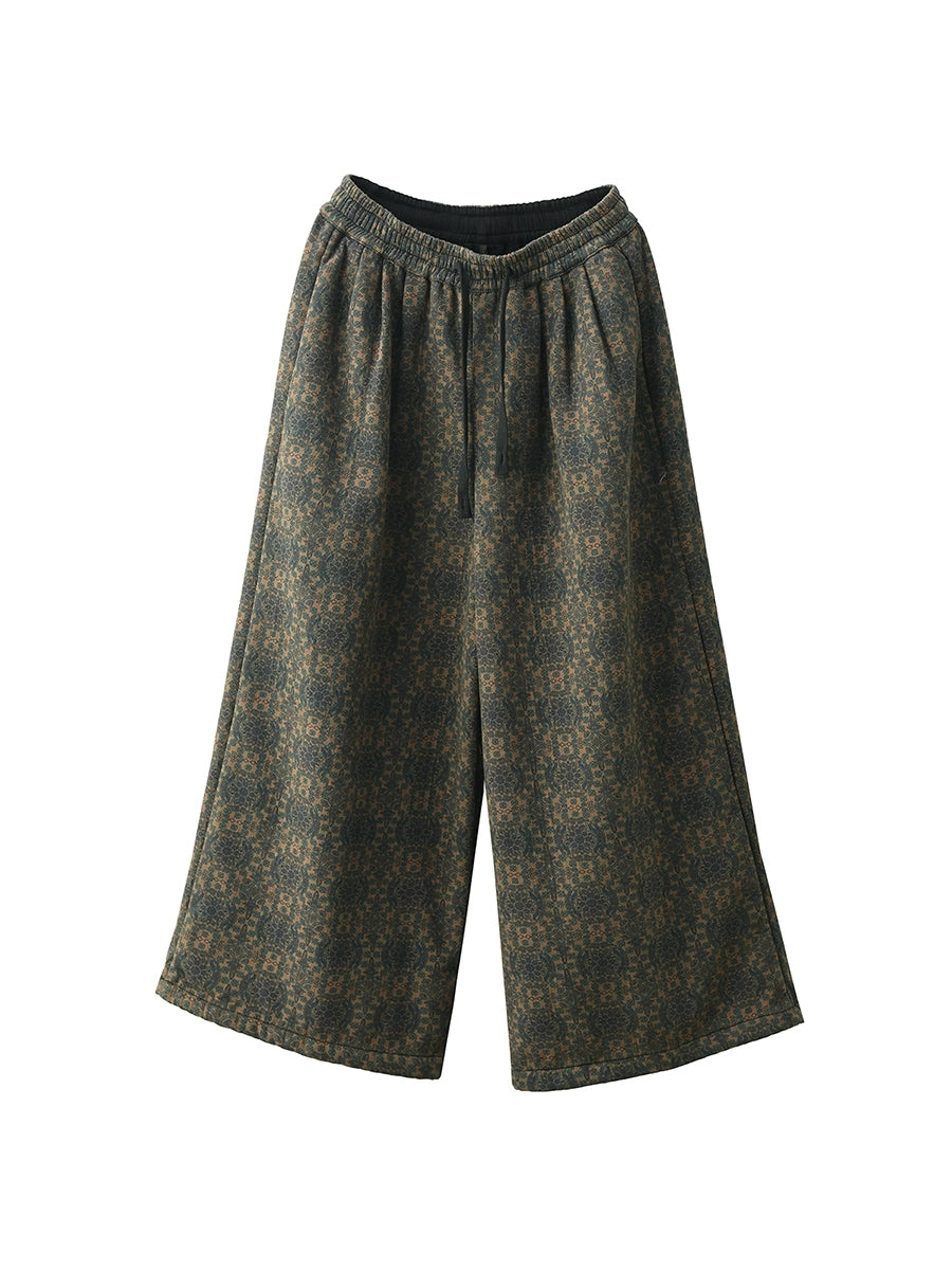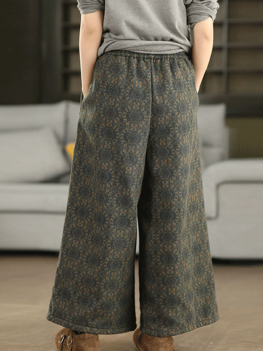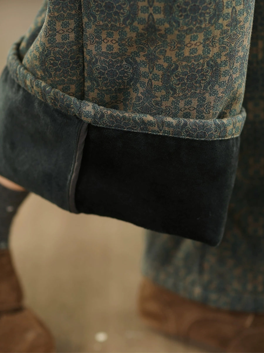 Women Winter Retro Flower Fleece-lined Straight Pants