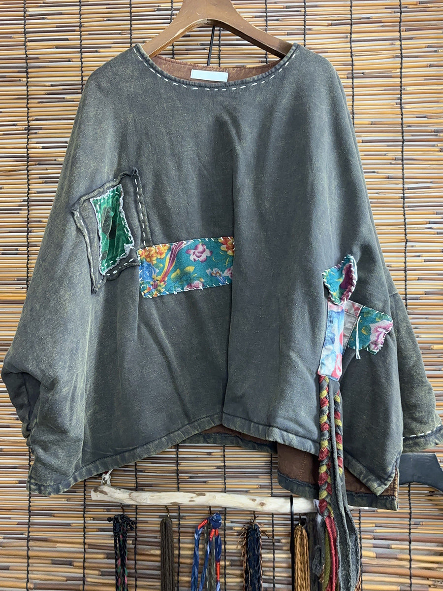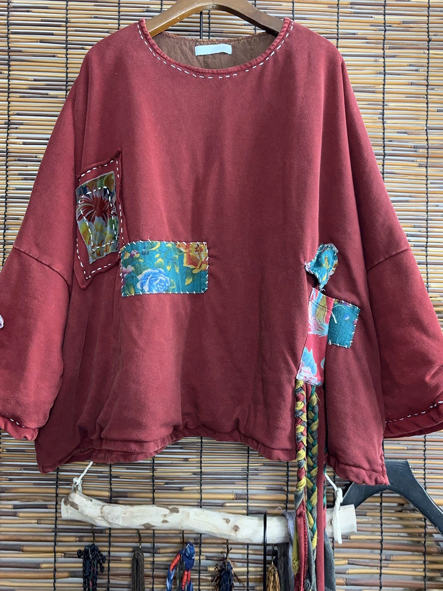 Women Winter Retro Patchwork O-Neck Tassel Suits