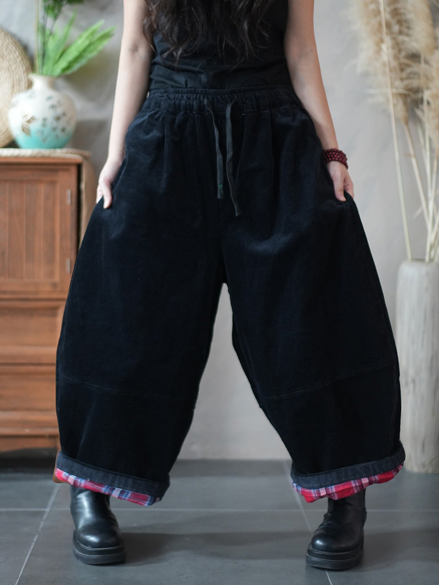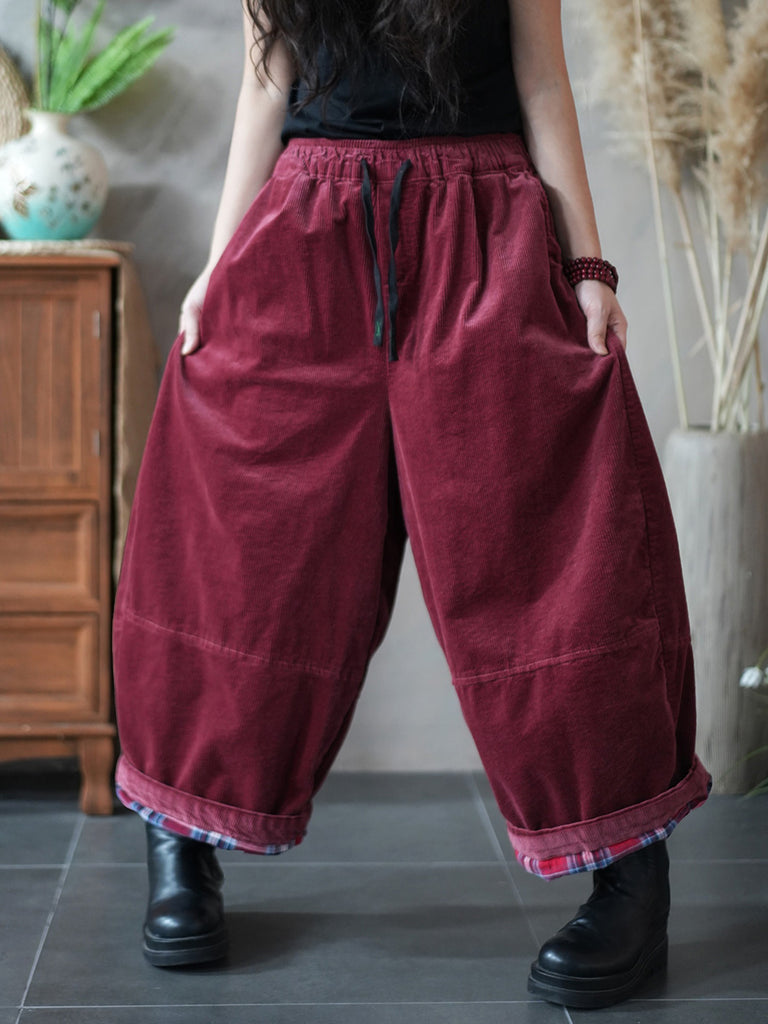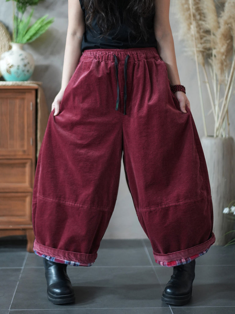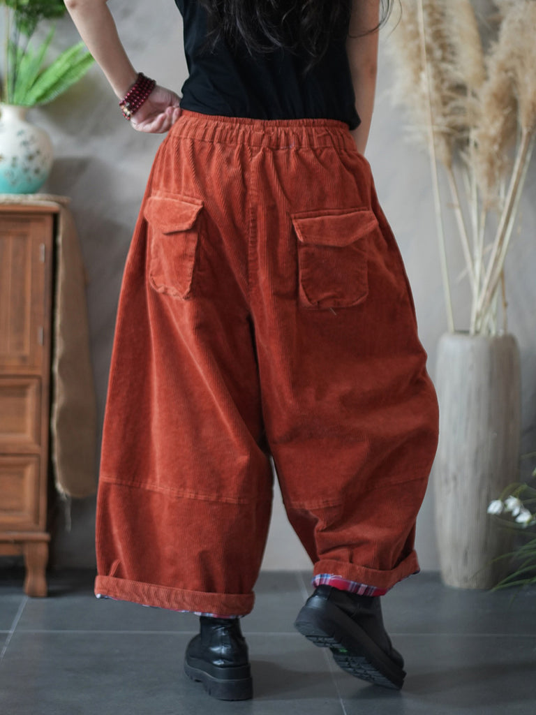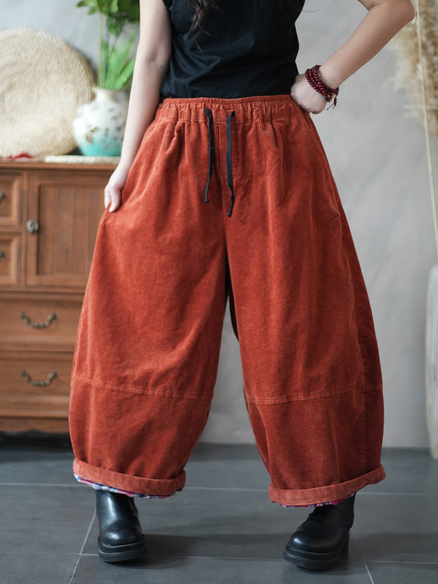 Women Winter Retro Pure Color Corduroy Wide-leg Pants