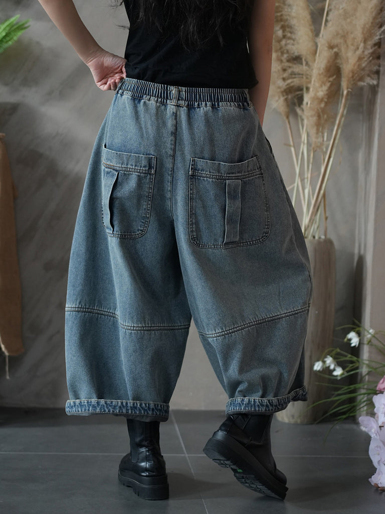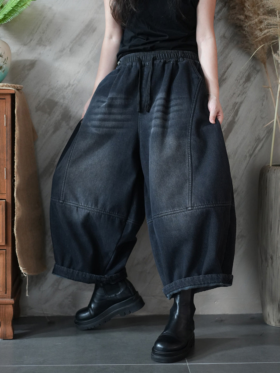 Women Winter Retro Pure Color Fleece-lined Denim Harem Pants