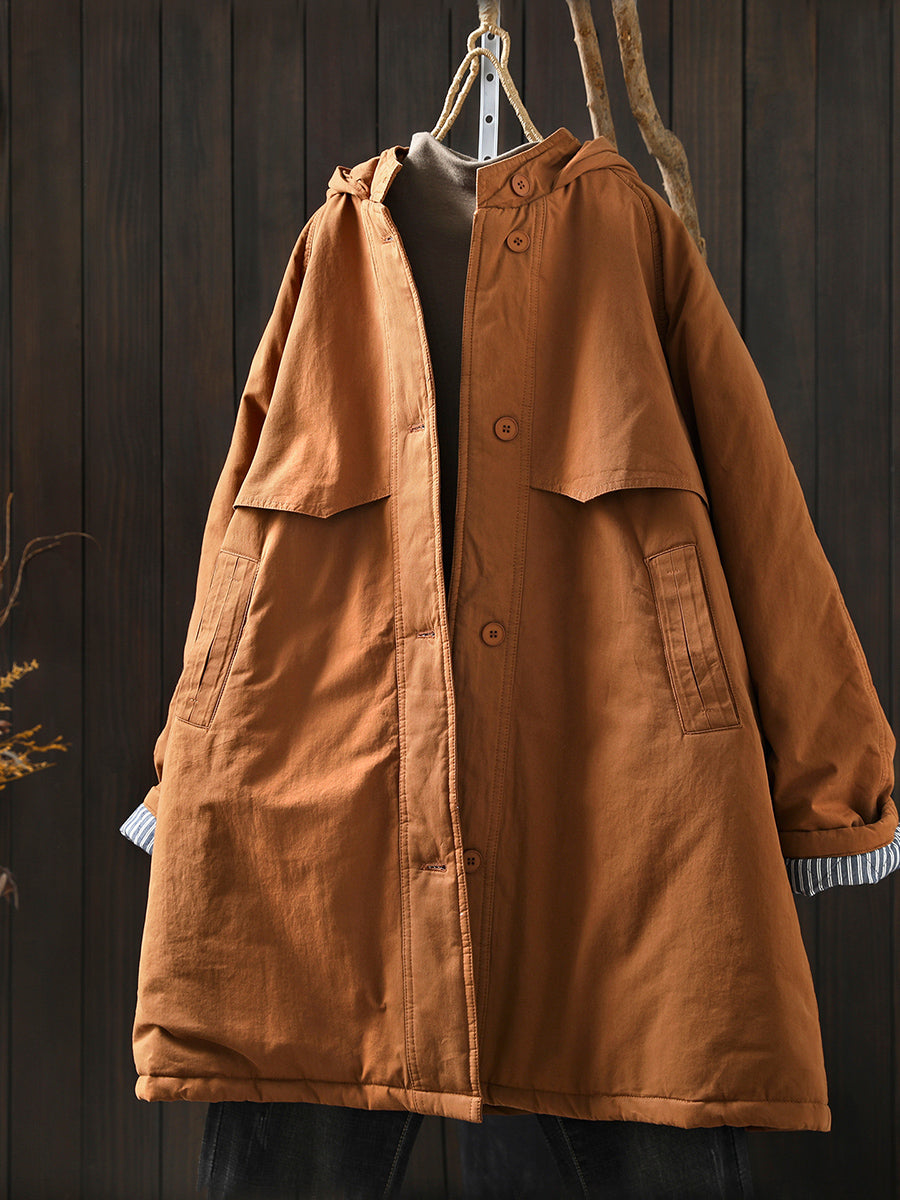 Women Winter Retro Pure Color Hooded Padded Coat