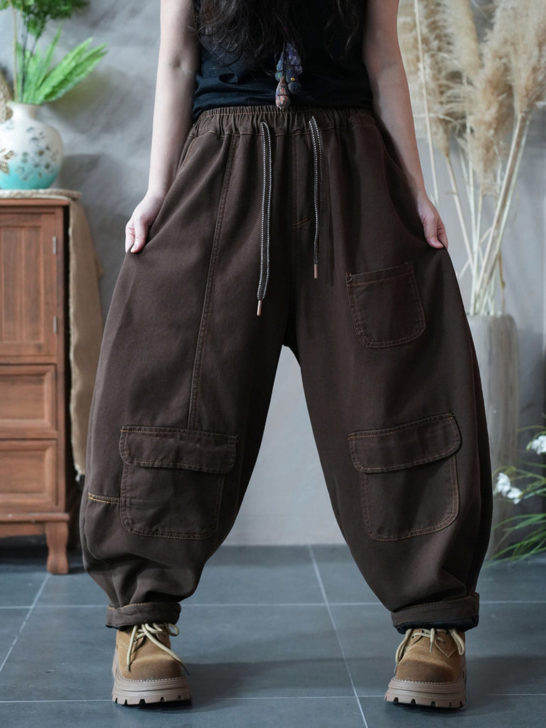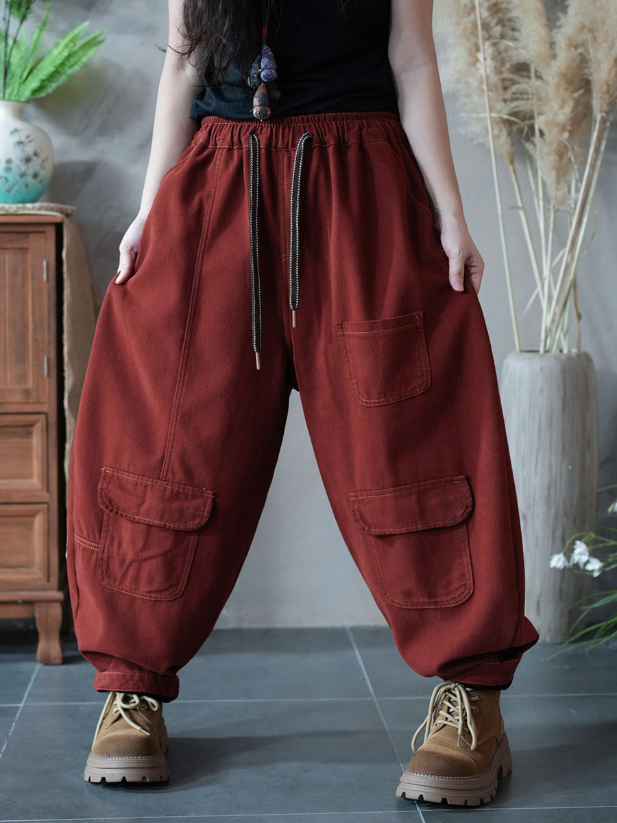 Women Winter Retro Pure Color Fleece-lined Harem Pants