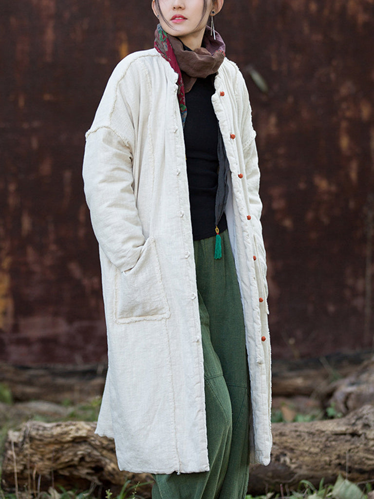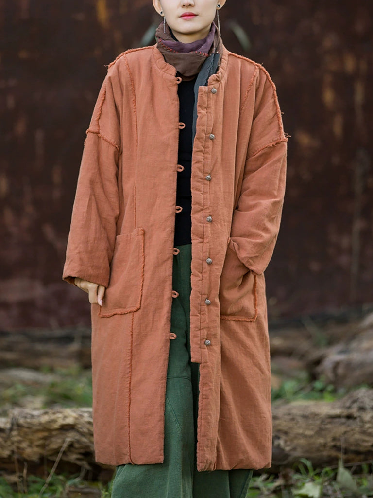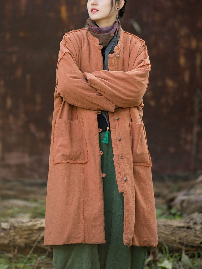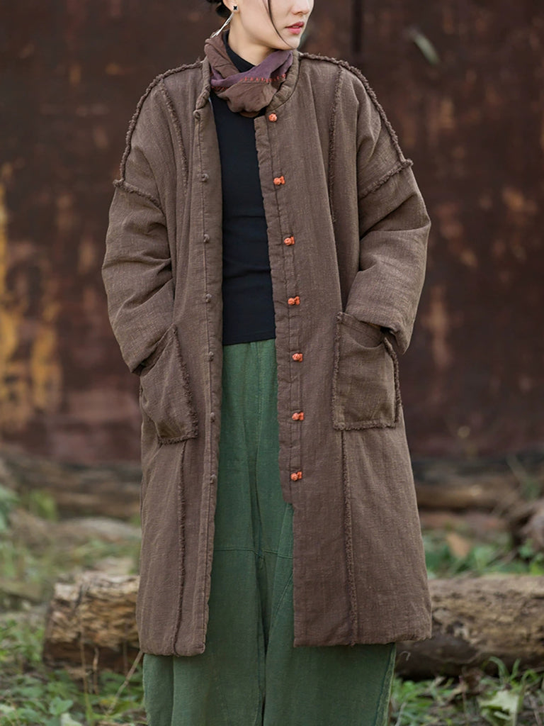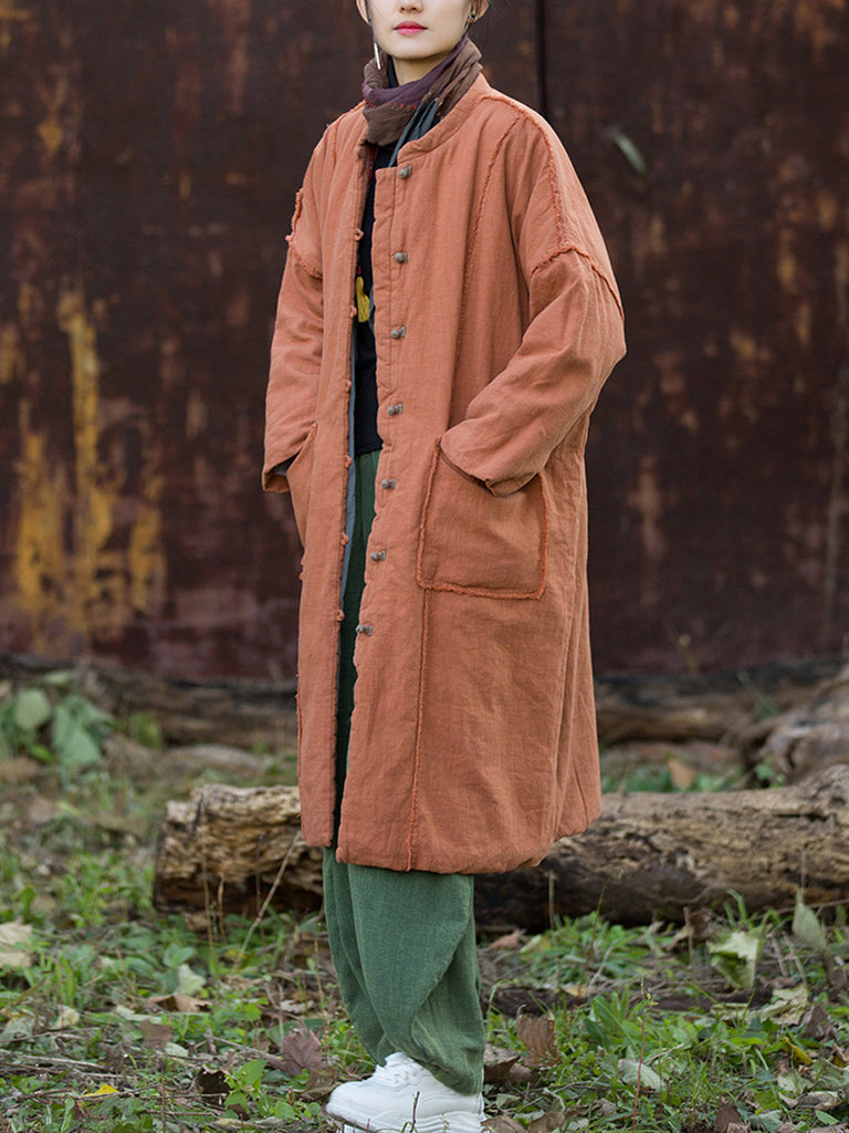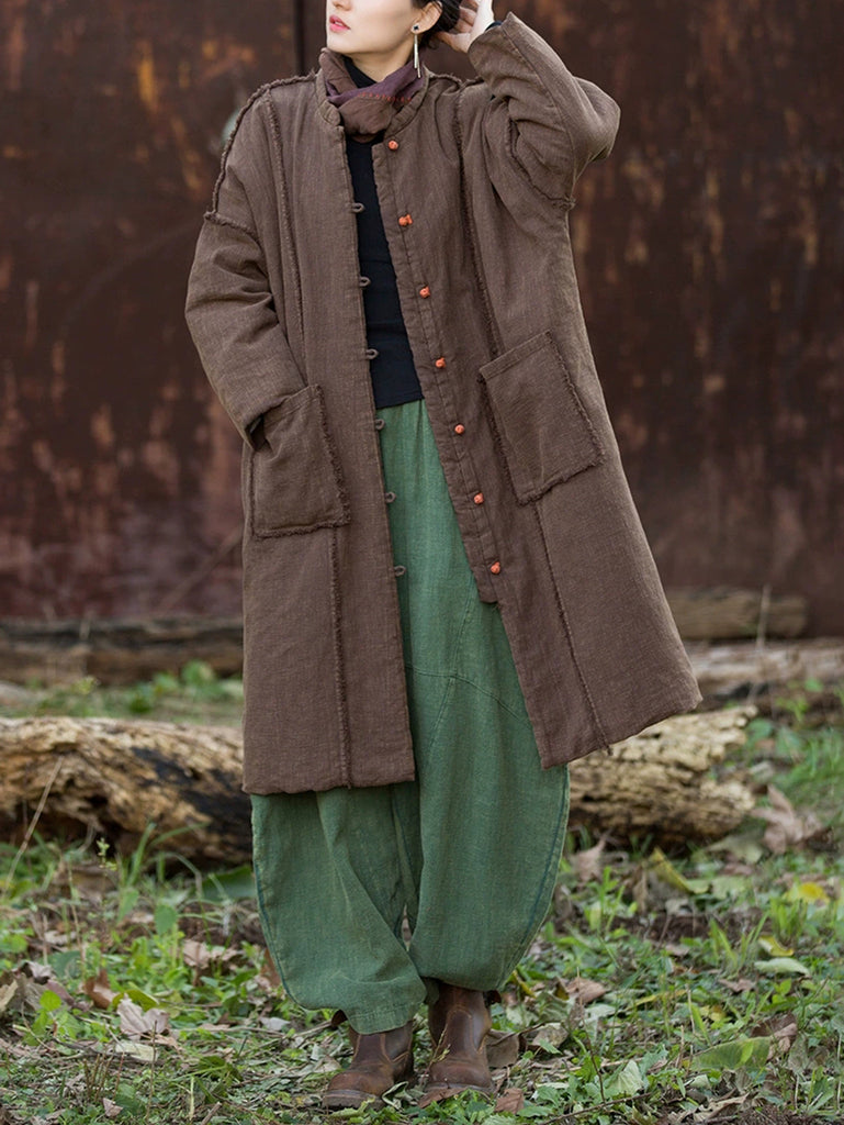Women Winter Retro Pure Color Ramie Padded Stand Collar Coat