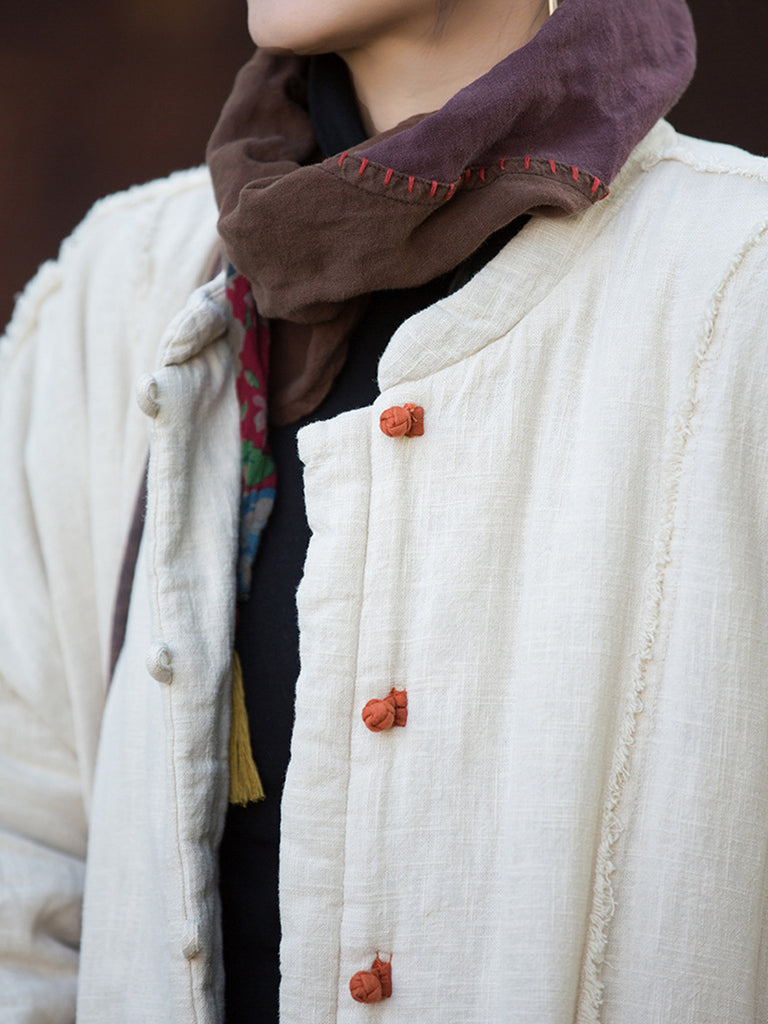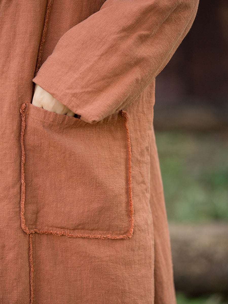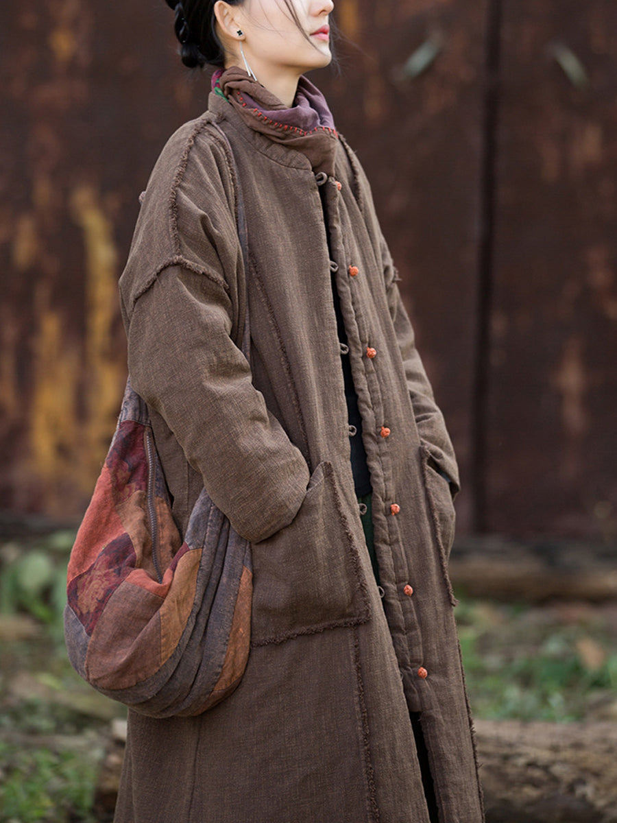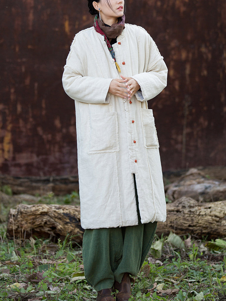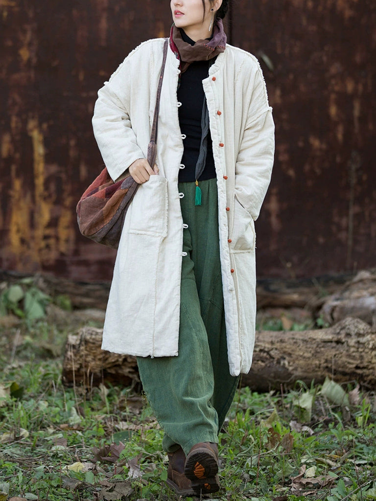 Women Winter Retro Pure Color Ramie Padded Stand Collar Coat