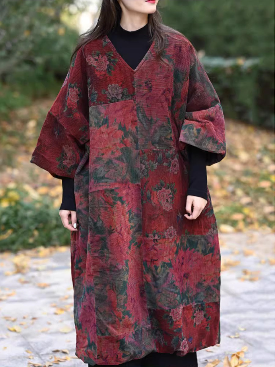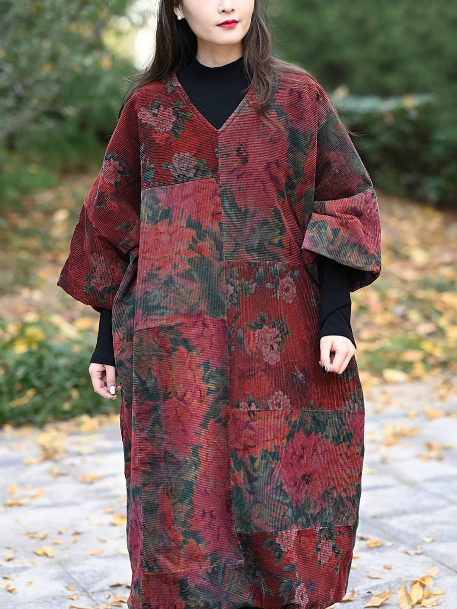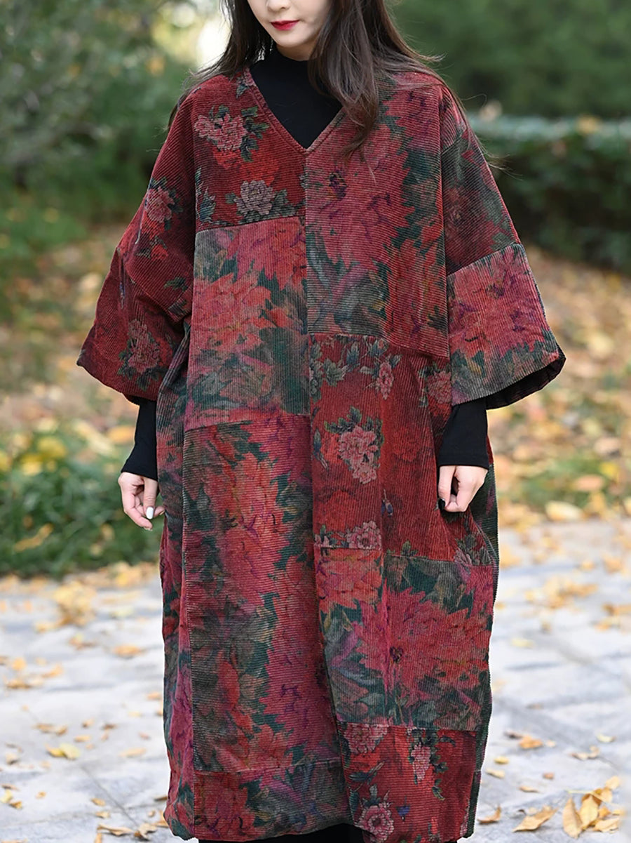 Women Winter Vintage Flower Patch Spliced Corduroy Robe Coat