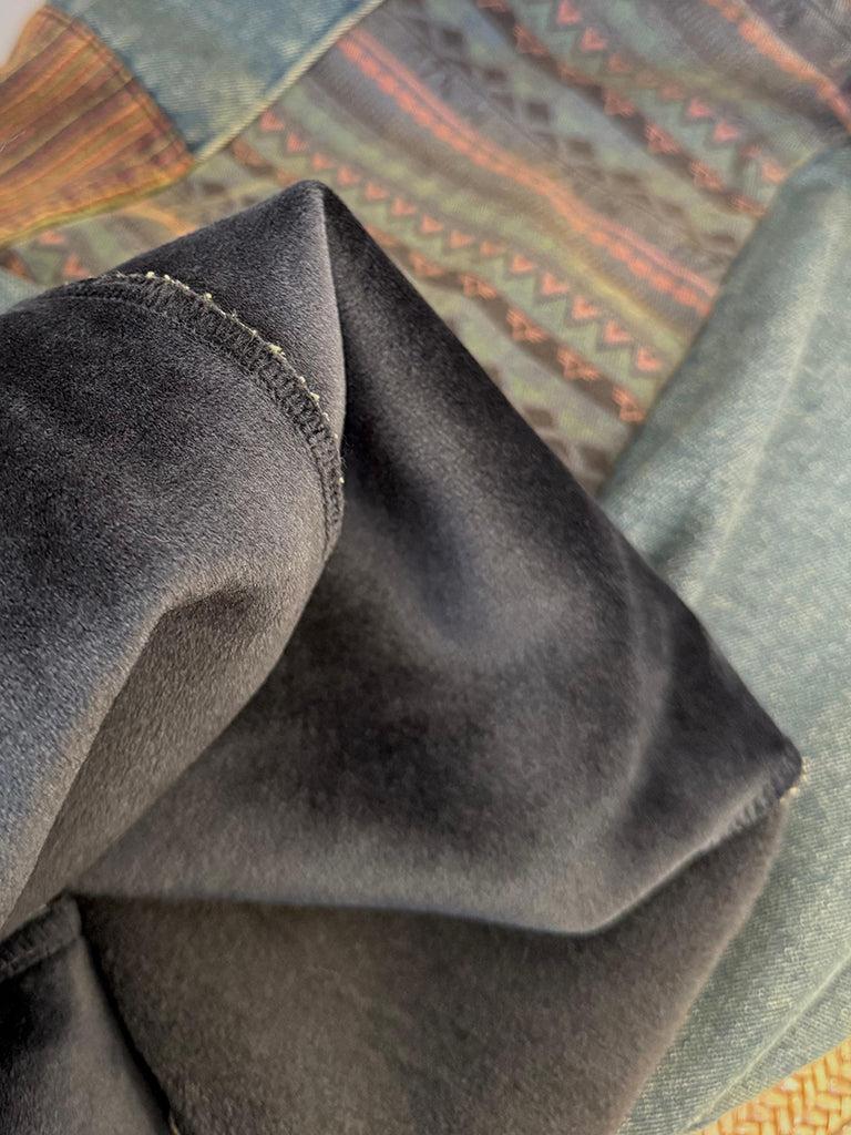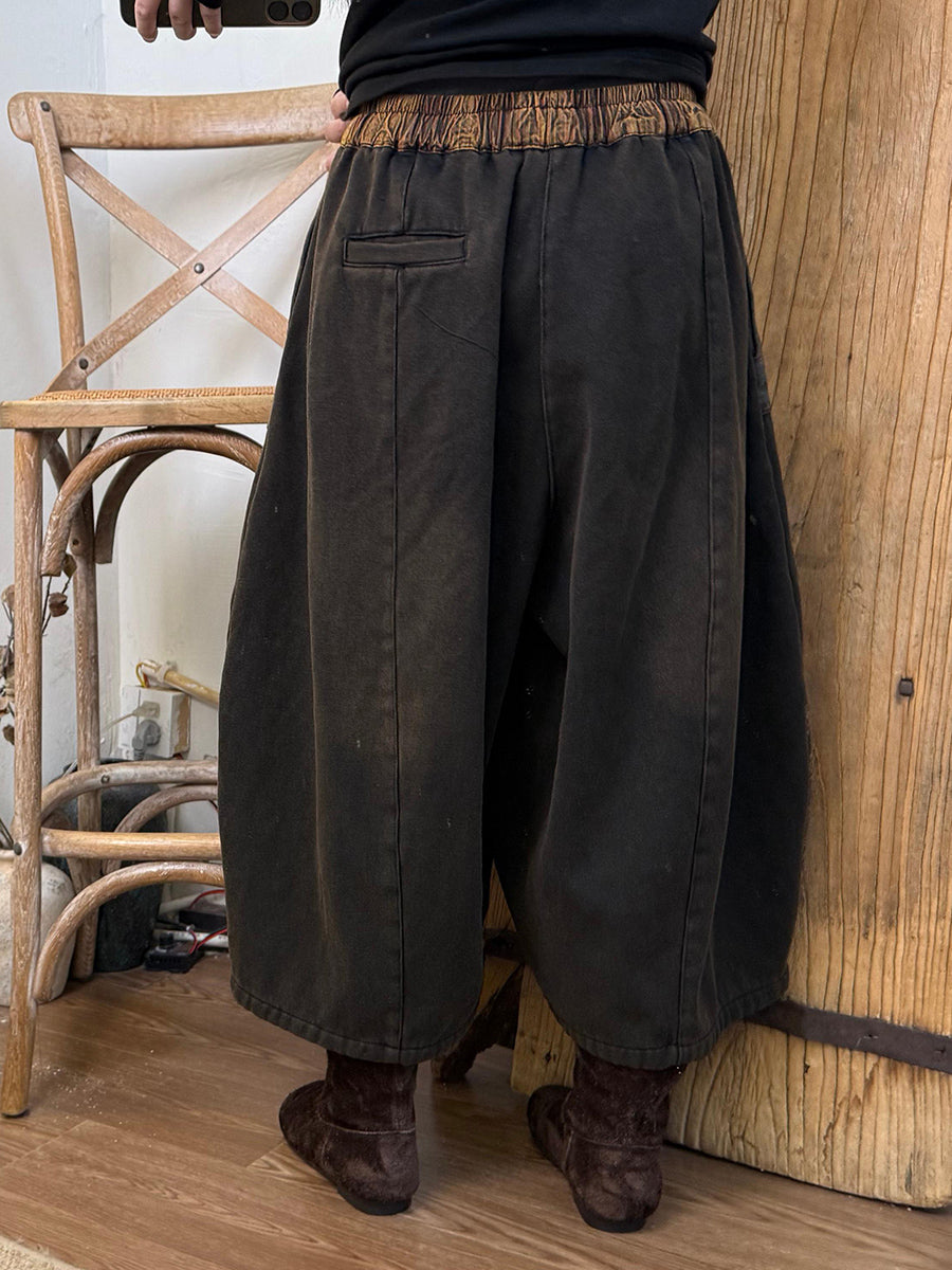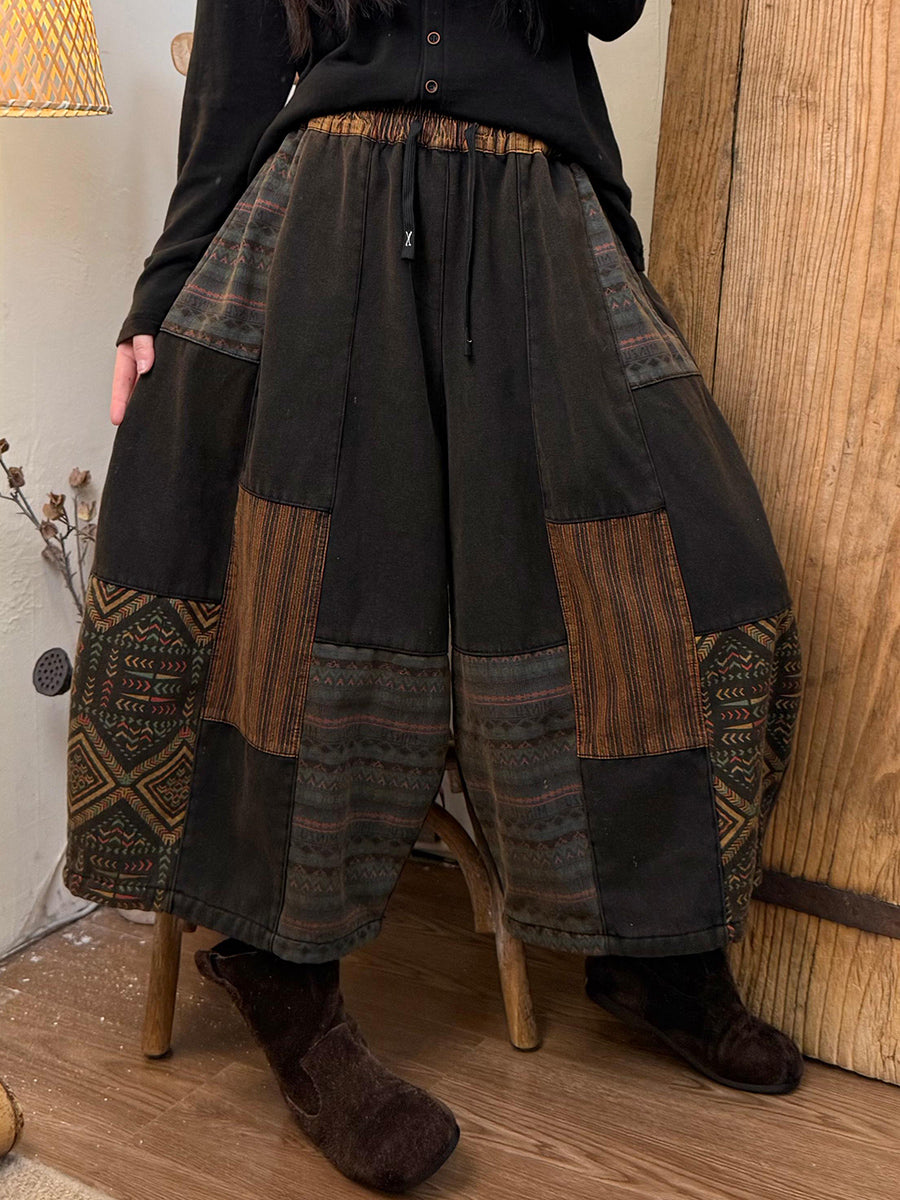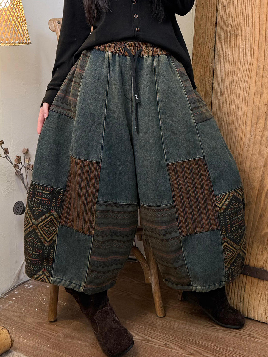 Women Winter Vintage Patchwork Fleece-lined Wide-leg Pants