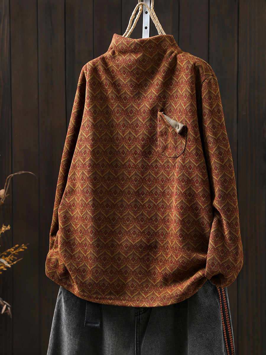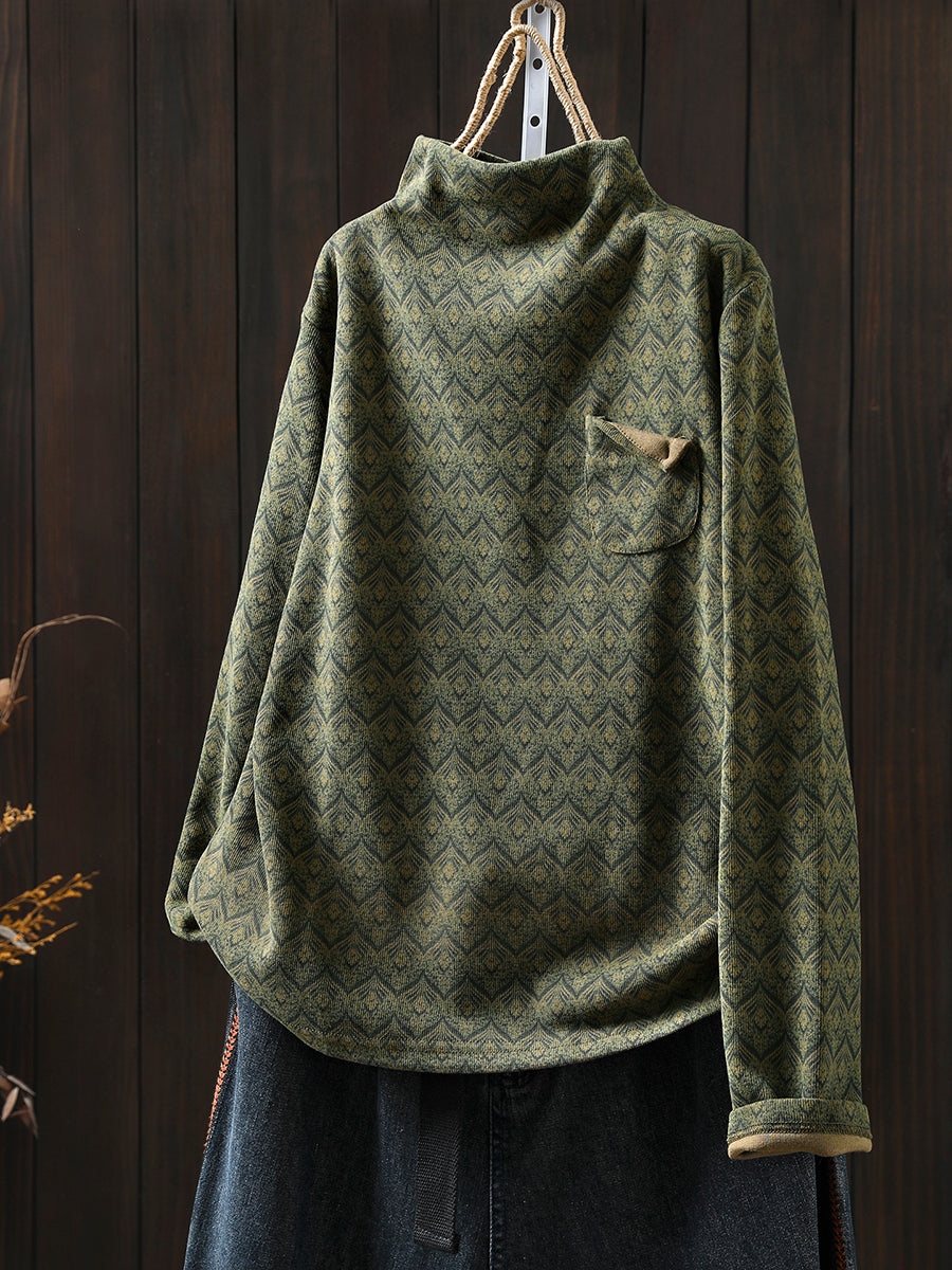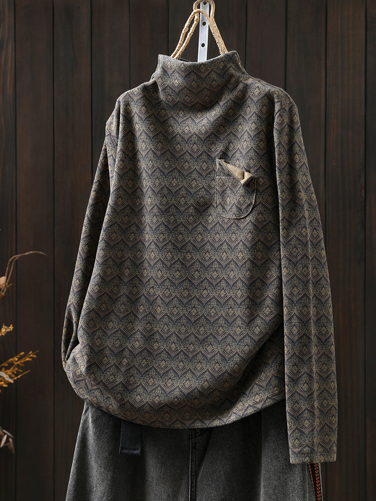 Women Winter Vintage Print Half-Turtleneck Blouse