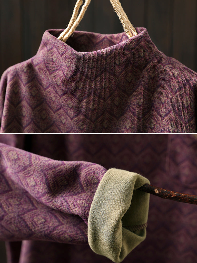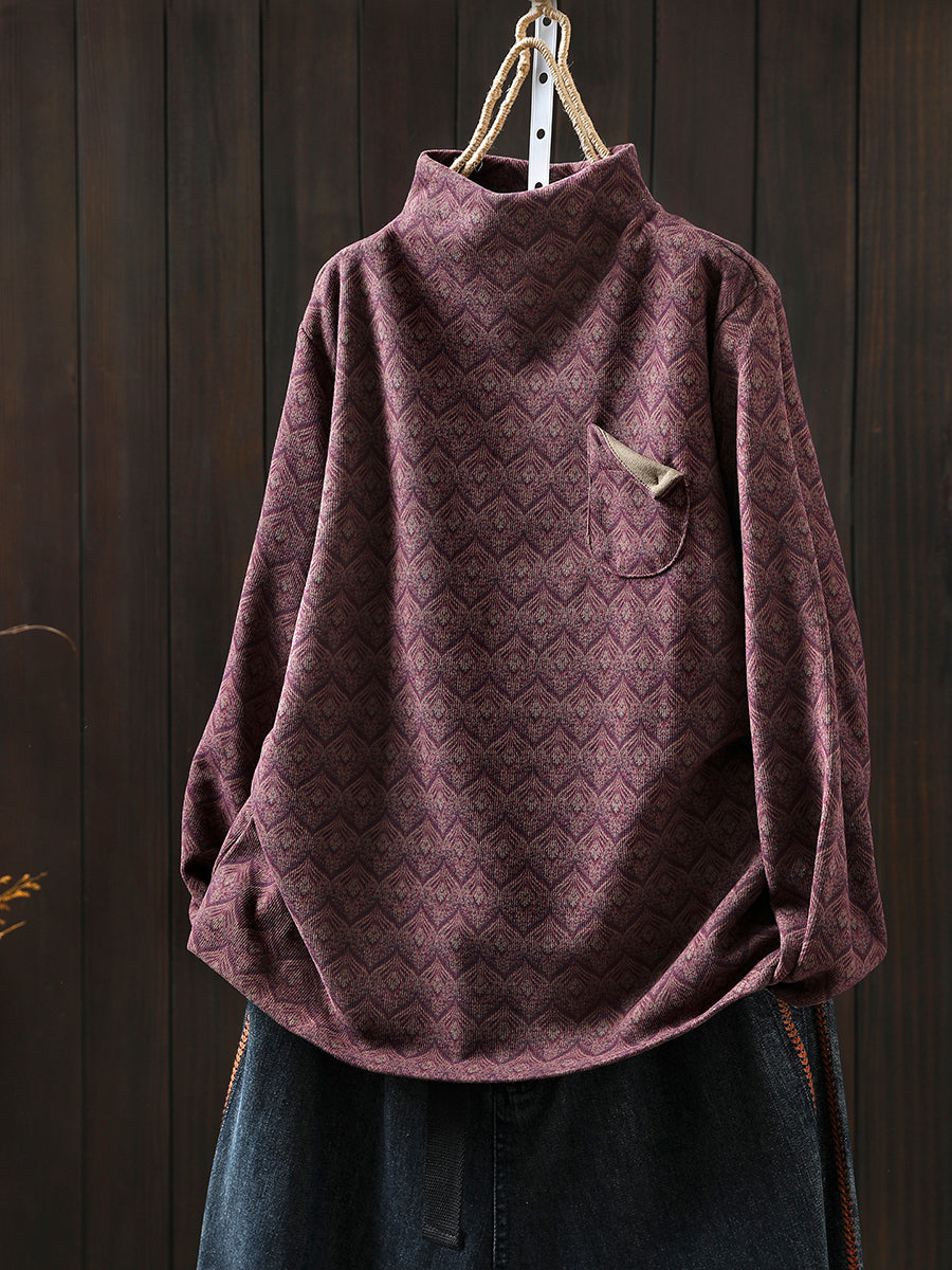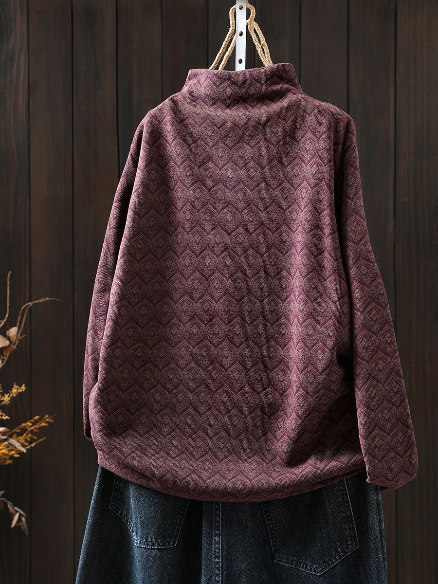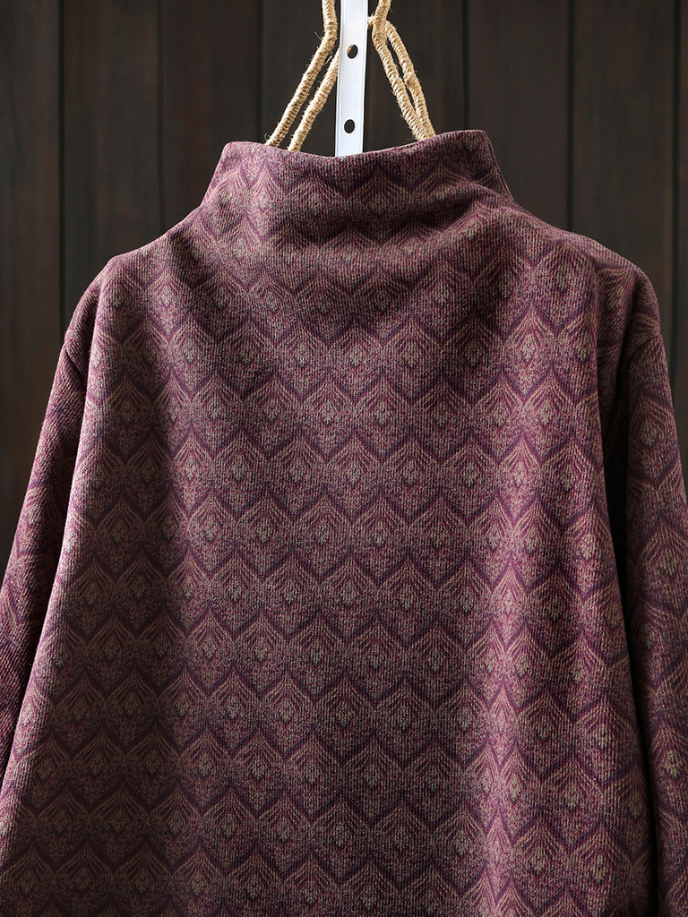 Women Winter Vintage Print Half-Turtleneck Blouse