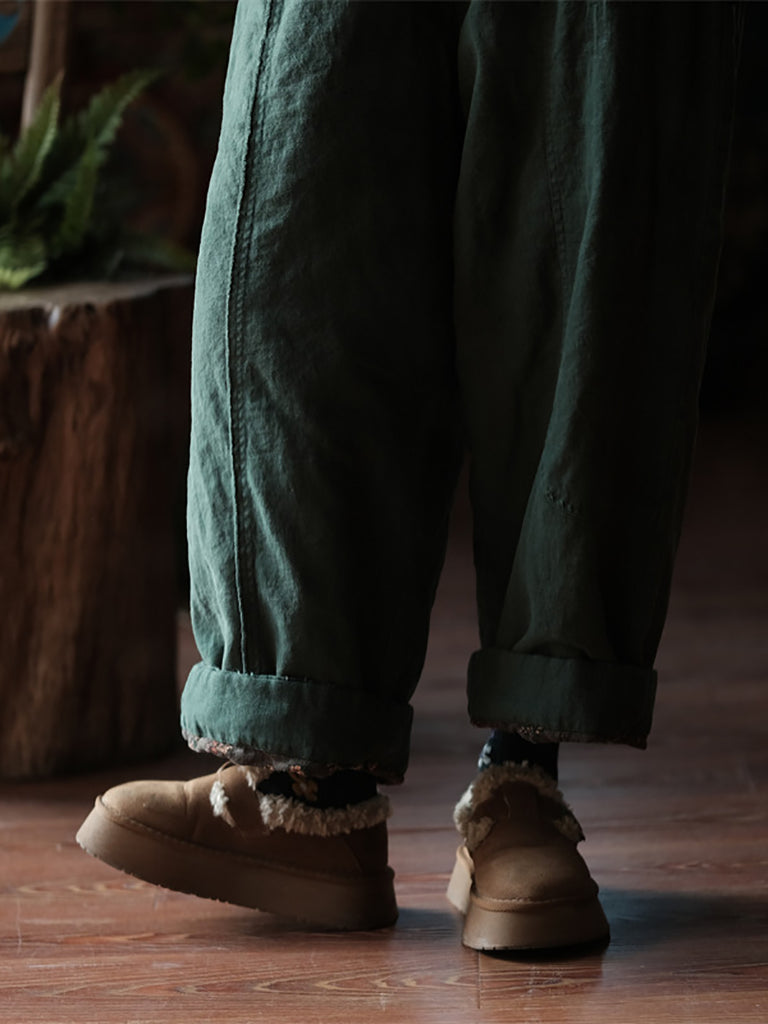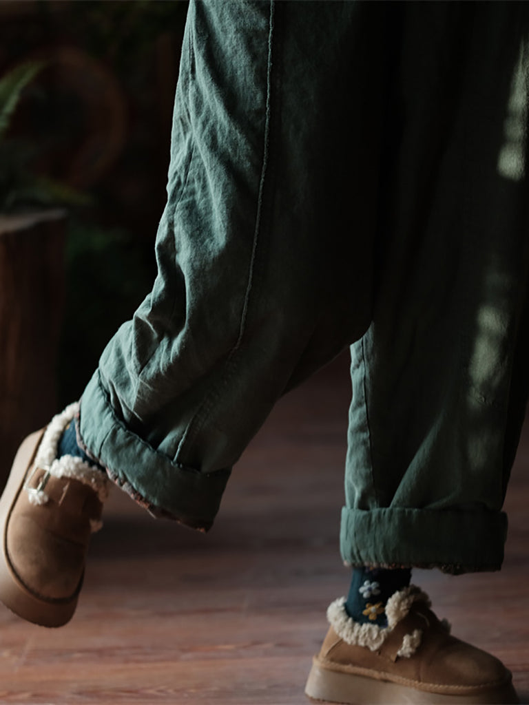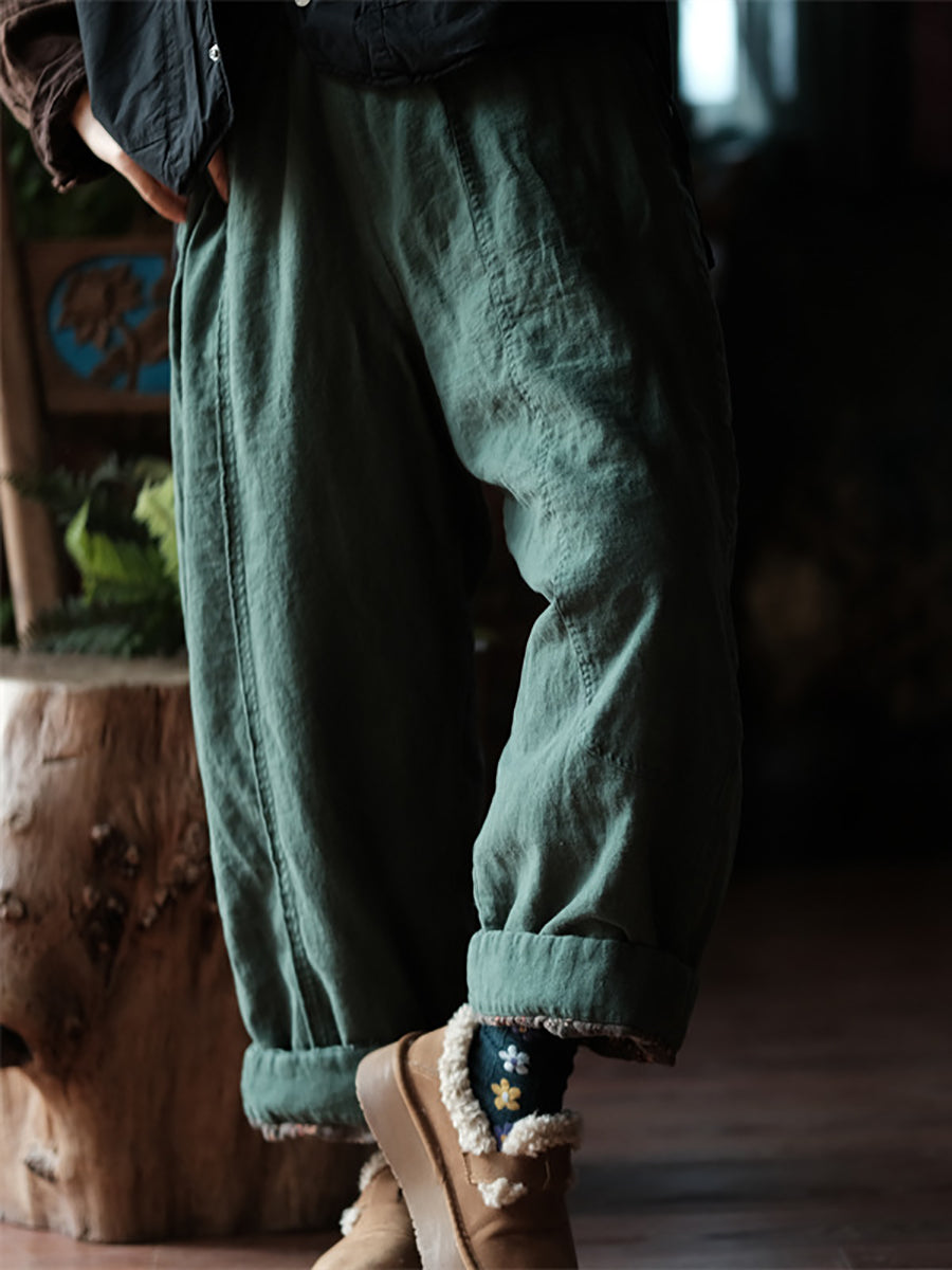 Crafted from a blend of cotton and linen, these straight pants offer both warmth and comfort for women during the winter season. The classic solid pattern and elastic waist provide a vintage touch to the overall design, making it a chic addition to any wardrobe.